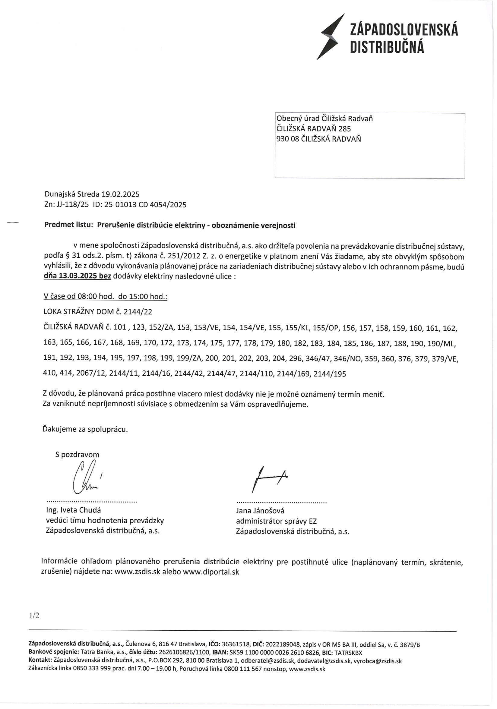 Plánované prerušenie distribúcie energie 13.03.2025!