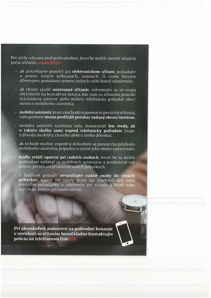 Podvodníci Vás opäť ohrozujú, osobne vyhľadávajú seniorov pod mienkou realizácie sčítania obyvateľov, snažia sa dostať do bytu, či do domu a následne využijúc dôverčivosť a nepozornosť seniorov okrádajú ich. V takomto prípade najskôr treba vyzvať takýchto podvodníkov, aby išli preč a potom sa obrátiť na POLÍCIU (volať na číslo 158).