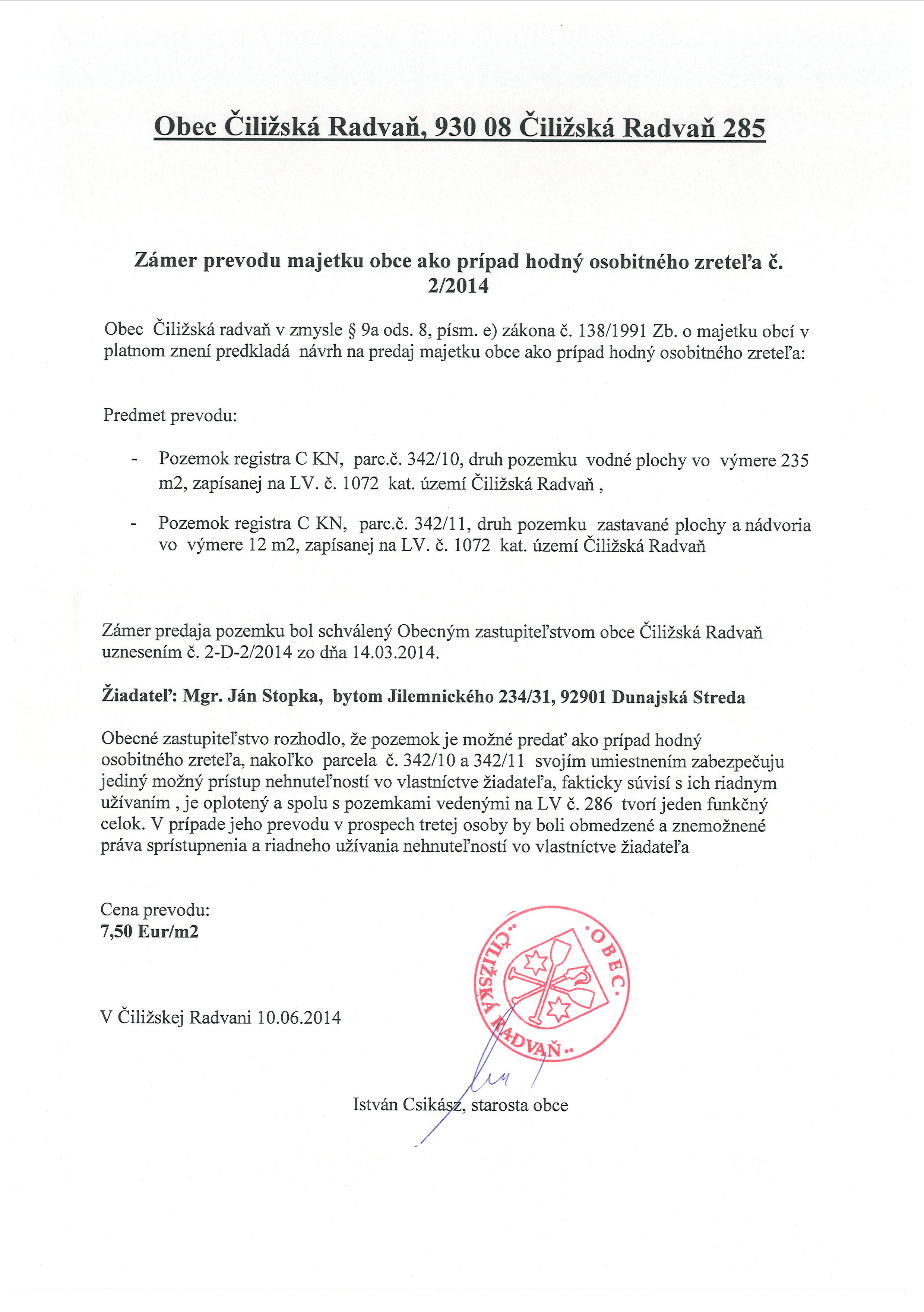 Zámer predaja majetku č. 2/2014